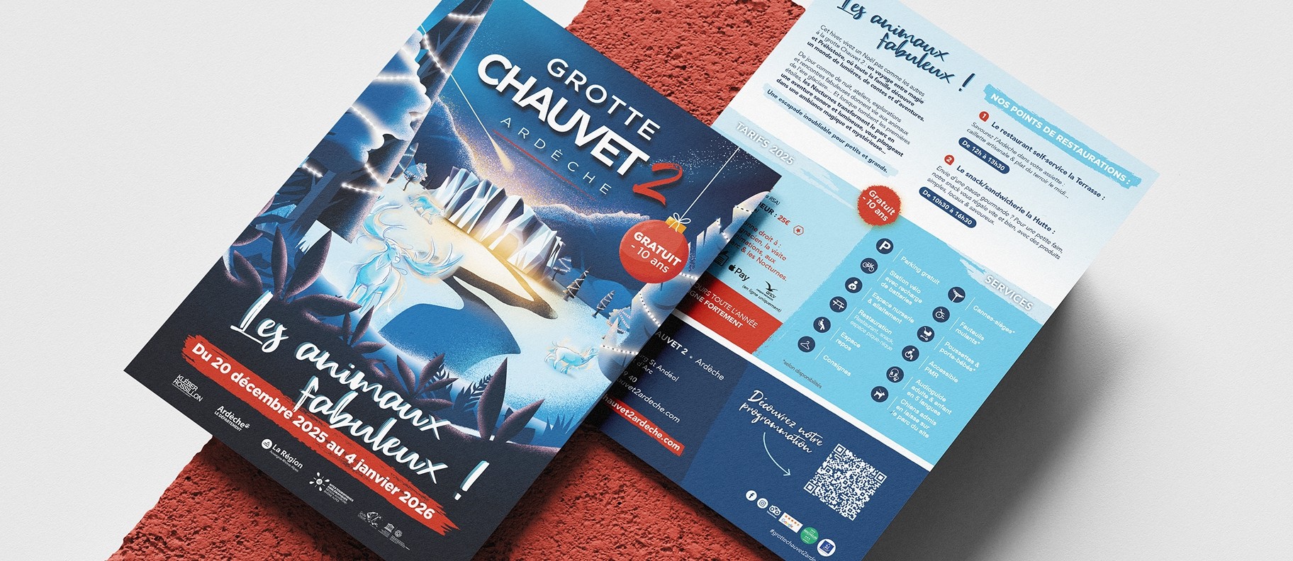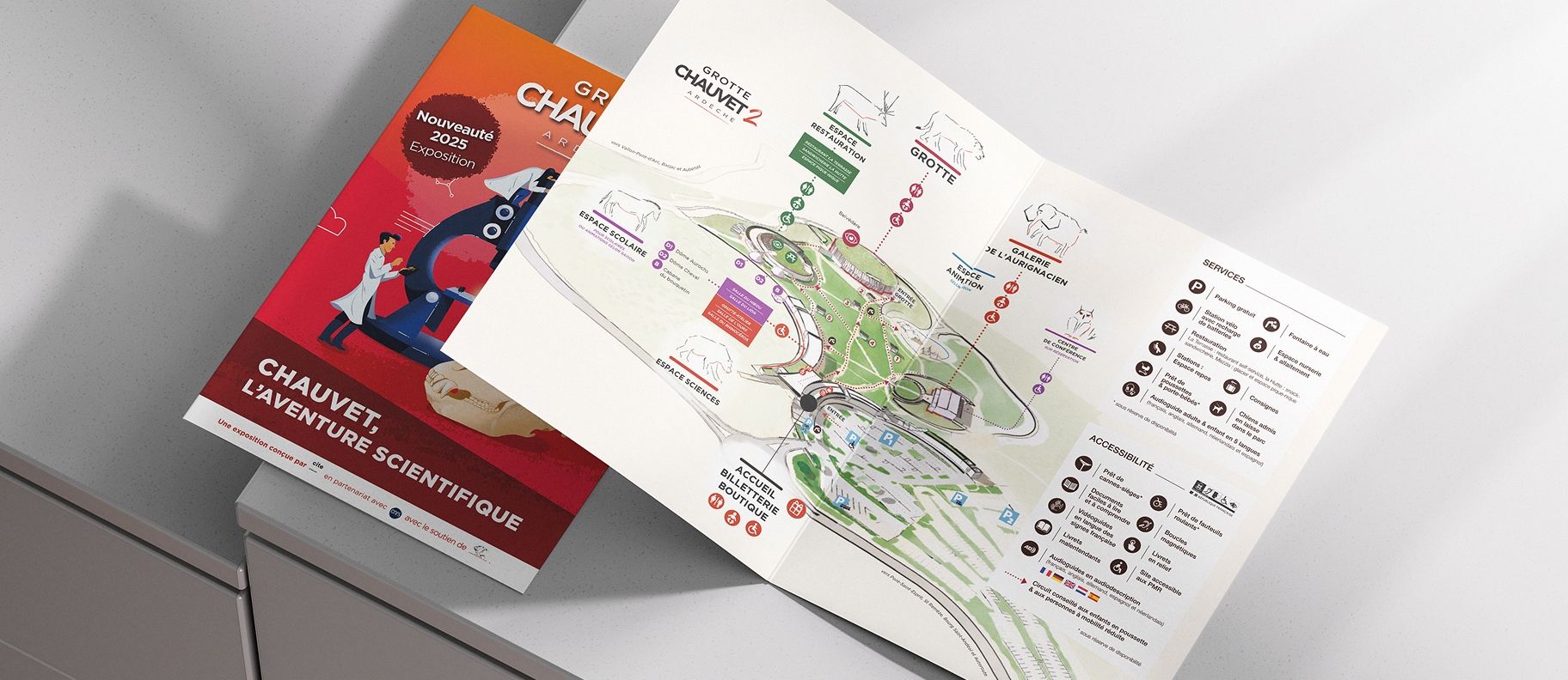 Le dépliant occupe une place centrale dans ce dispositif. Pensé comme un guide de découverte, il combine informations pratiques, cartographie du site, temps forts et mise en valeur des différentes expériences proposées. La direction artistique s’inspire de l’art pariétal : palette sépia, textures brutes et effets de matière évoquant les fresques millénaires.
